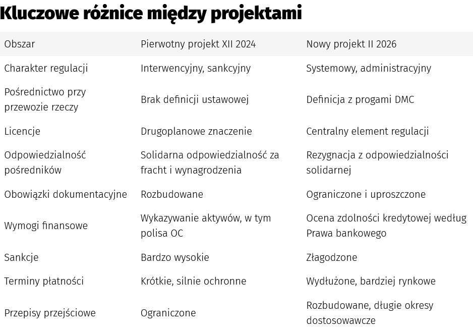 Porównanie obu wersji pokazuje, że ustawodawca odszedł od rozwiązań silnie interwencyjnych i sankcyjnych na rzecz bardziej systemowego i administracyjnego modelu regulacji rynku. Zmiana ta ma istotne znaczenie dla przewoźników, pośredników przy przewozie rzeczy oraz całego sektora TSL.