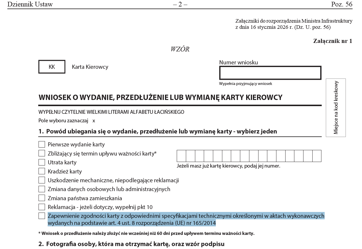 We wniosku o wydanie, przedłużenie lub wymianę karty kierowcy, jako powód ubiegania się o wymianę karty kierowcy dodano nową pozycję: