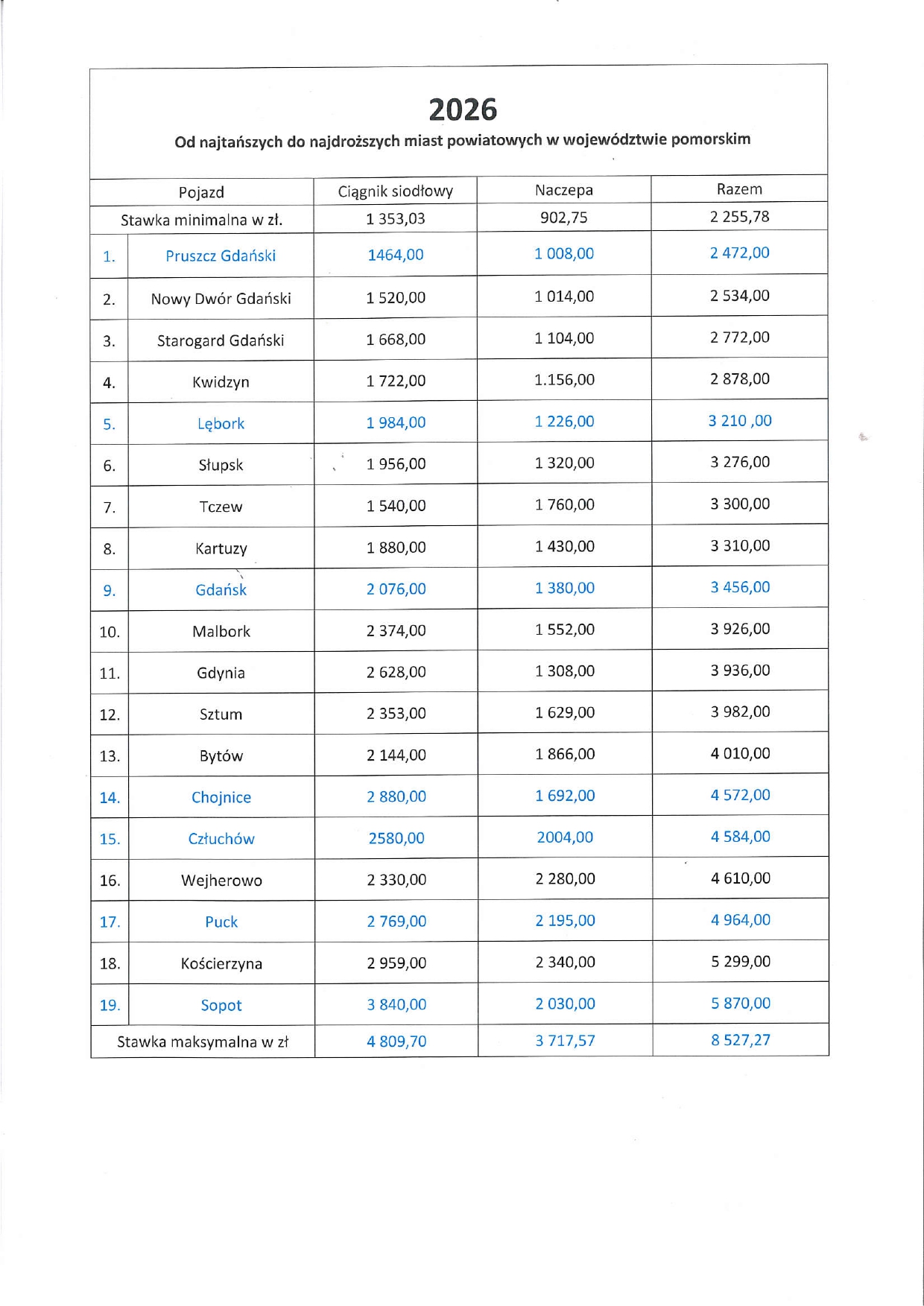 Udział Ministra Finansów, w kwestii niniejszego podatku sprowadza się tylko do określenia minimalnych i maksymalnych stawek na dany rok. Minimalne stawki na 2026 rok nie zostały podwyższone w przeciwieństwie do maksymalnych. Pojazdem porównawczym w rankingu jest typowy zestaw naczepowy tzn. ciągnik siodłowy (2-osiowy), naczepa (3-osiowa)