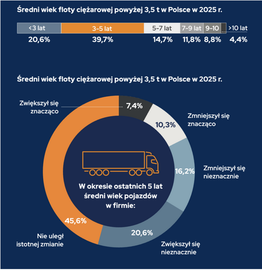 Struktura wiekowa ciężkich pojazdów w Polsce jest optymistyczna, ponieważ blisko 60% flot ma nie więcej niż pięć lat. Największa grupa firm, stanowiąca 39,7% badanych, deklaruje, że średni wiek ich pojazdów mieści się w przedziale od 3 do 5 lat, natomiast co piąte przedsiębiorstwo posiada samochody młodsze niż 3 lata.