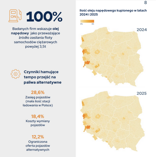 Główną barierą powstrzymującą transformację energetyczną w transporcie ciężkim jest niedostatecznie rozwinięta infrastruktura paliw alternatywnych. Brak odpowiedniej sieci stacji tankowania i ładowania w Polsce jest problemem dla 28,6% firm, a w przypadku tras międzynarodowych dla 26,5% respondentów.