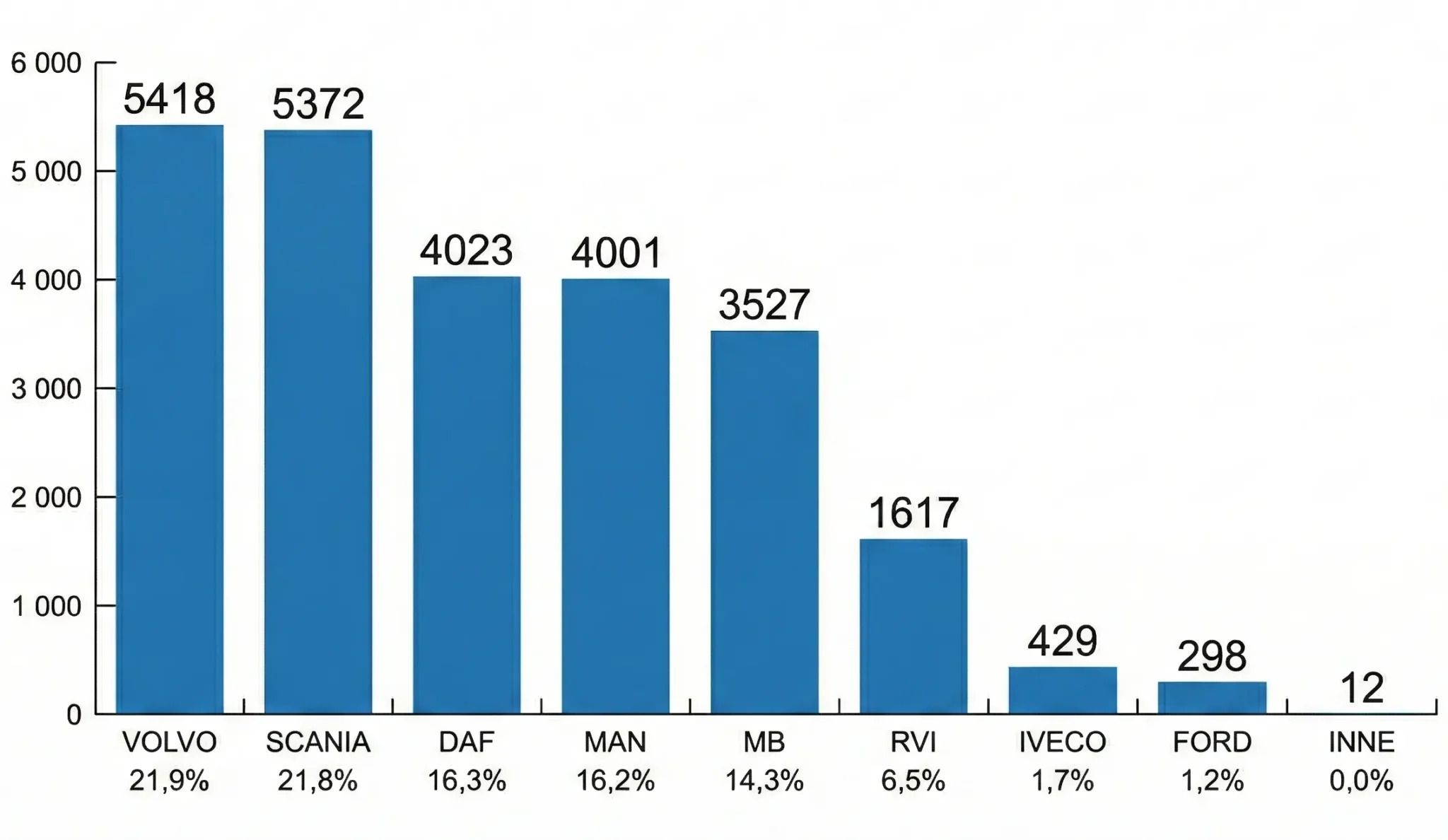 Od stycznia do listopada 2025 roku dwie szwedzkie marki osiągnęły łącznie 43,7 procenta udziału w polskim rynku nowych, ciężkich samochodów ciężarowych, powyżej 16 ton. Innymi słowy, Szwedzi odpowiadali za blisko połowę rynku. Co więcej, udziały obu marek okazały się niemal identyczne, jako że Volvo Trucks odpowiadało za 21,9 procenta sprzedaży, a Scania za 21,8 procenta. Ilościowo przełożyło się to na odpowiednio 5418 oraz 5372 egzemplarze, a więc różnica ograniczała się do zaledwie 46 egzemplarzy.