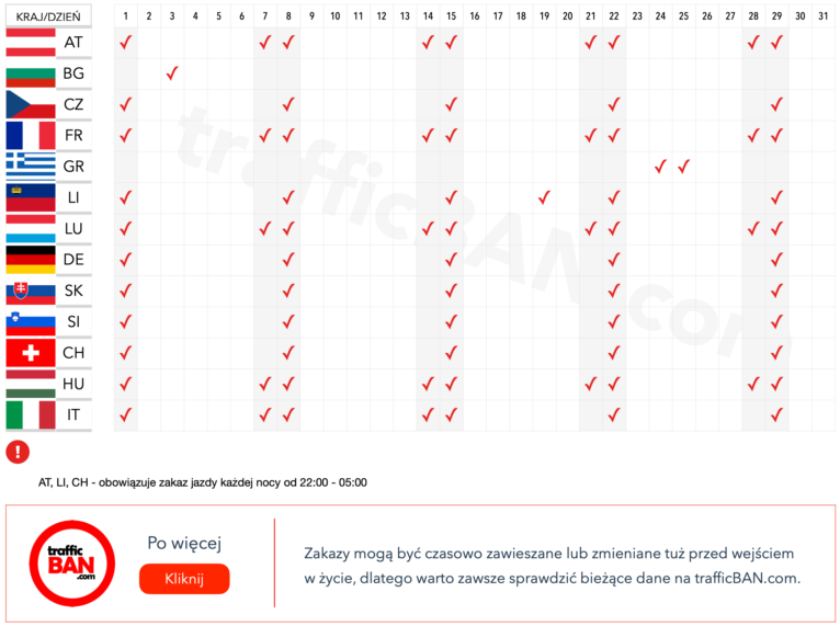 W serwisie www.trafficban.com w zakładce każdego z państw znajdziecie szczegółowe informacje dotyczące ograniczeń dla ciężarówek, w tym listę odstępstw i zwolnień z zakazów.
