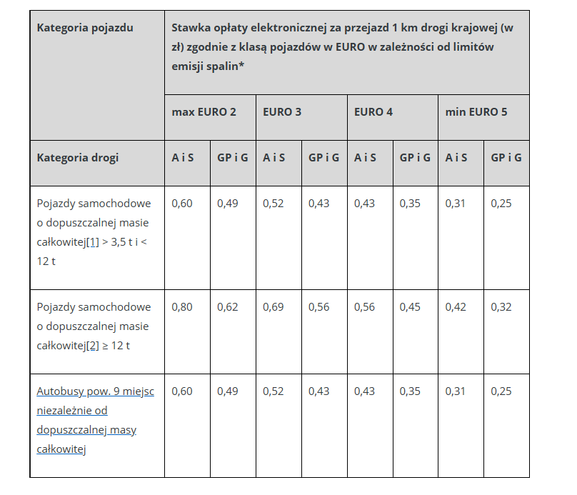 Wysokość stawek opłaty elektronicznej za przejazd 1 km dla dróg krajowych klasy A i S lub ich odcinków oraz klasy GP i G lub ich odcinków obowiązujących od 1 stycznia 2026 roku: